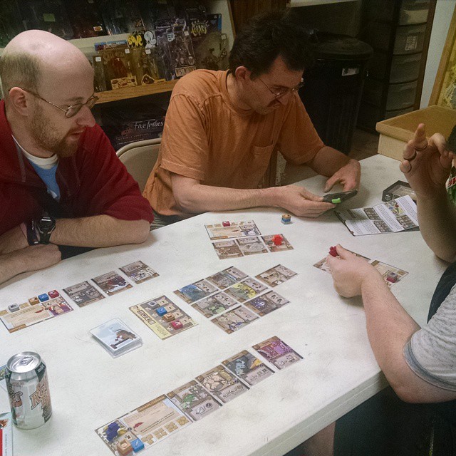 Mechanics– I was serious before, this game feels like a mix of two great tastes making something better. You have the card use of Battlestar Galactica for hidden card resolution and turn events with the simplistic combat of Zombicide. Those two things work amazingly well together. This game is MUCH more swingy then Zombicide as dice dictate actions and combat results, but once you know your dice for a turn, you pretty can plan out your turn. It’s quick, easy to play, and not any more complicated than it needs to be. The crossroads cards are fun, but they might have been a bit over sold. You do have random events happen, but I expected something a bit more intricate. What does happen is about one out of every four turns, something unexpected will happen. It does add something interested, but don’t expect the moon. 4.5/5