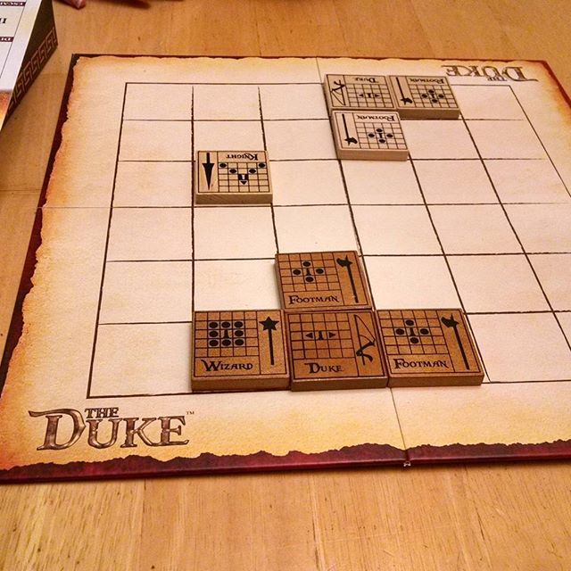 Mechanics-This is chess, but fun. The Duke has awesome, simple mechanics. Instead of remembering how each piece moves, the simple diagrams provide all the explanation a player needs to make smart choices. The flipping of each piece is just amazing as the quick transition is easily pulled off and creates a dynamic play experience. I even love the randomness that comes out of this game. Master players will always have to adapt to new pieces, while novice players won’t get steamrolled like most new chess players might. 5/5