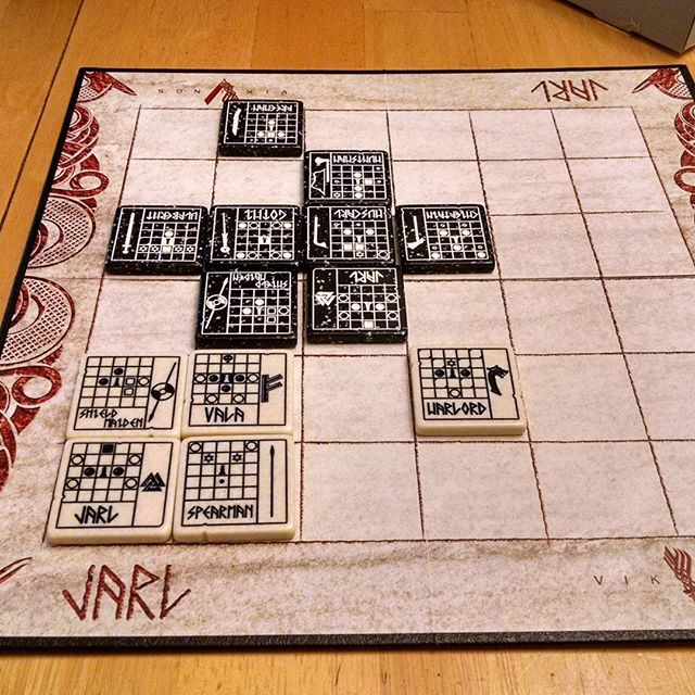 Basics- It’s time to go to war! Jarl is a stand alone expansion for The Duke. Just like The Duke, players start with a few pieces on the board, and on a turn can either move a piece which causes the piece to flip at the end of its movement, or randomly draw a new piece and place it on the board. Aside from that simple introduction, this game plays like Chess. Players attempt to maneuver their opponent into a situation where their king or Jarl will be captured. Last man or women standing is the winner