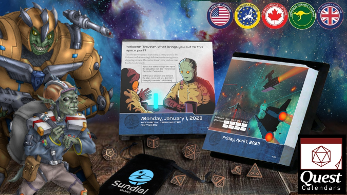 Basics– NO GM, NO PROBLEM!. Quest Calendar is a desk calendar that has a simple story that you walk through each day with puzzles, combat, and a solid story to draw you in. 2022 had a fantasy, world hopping adventure, and this year 2023 is a universe spanning Sci-Fi epic. let’s break it down!