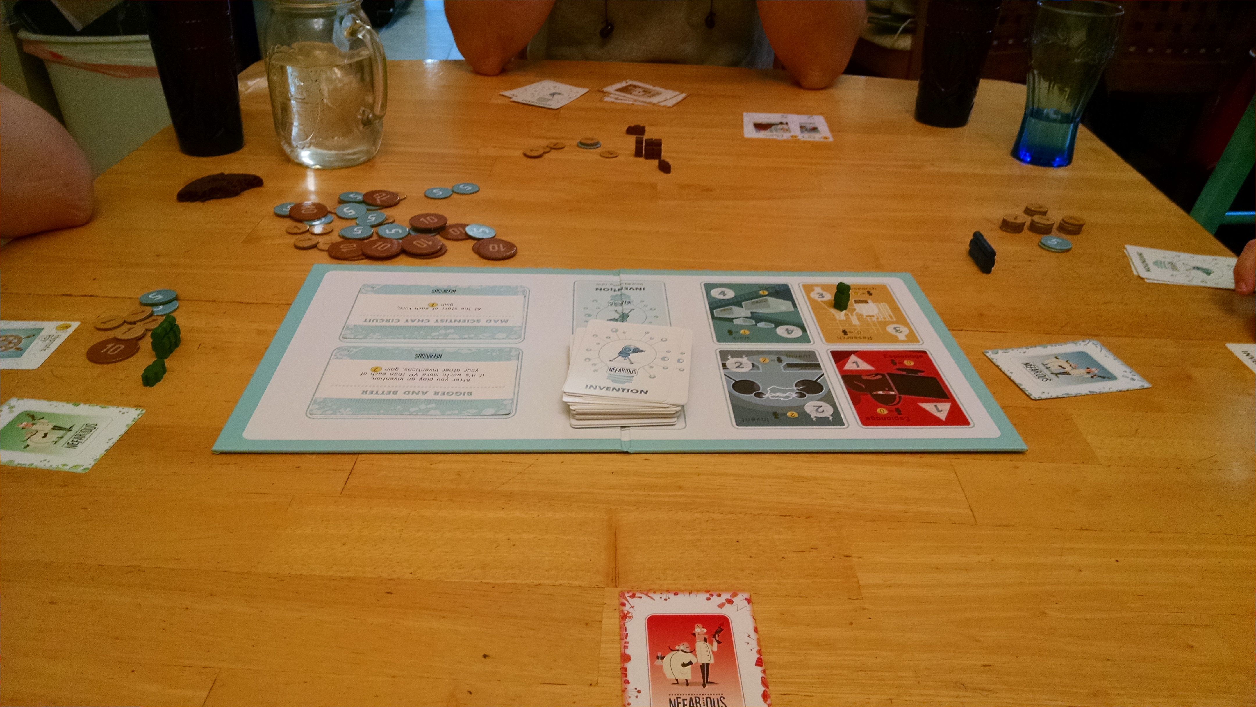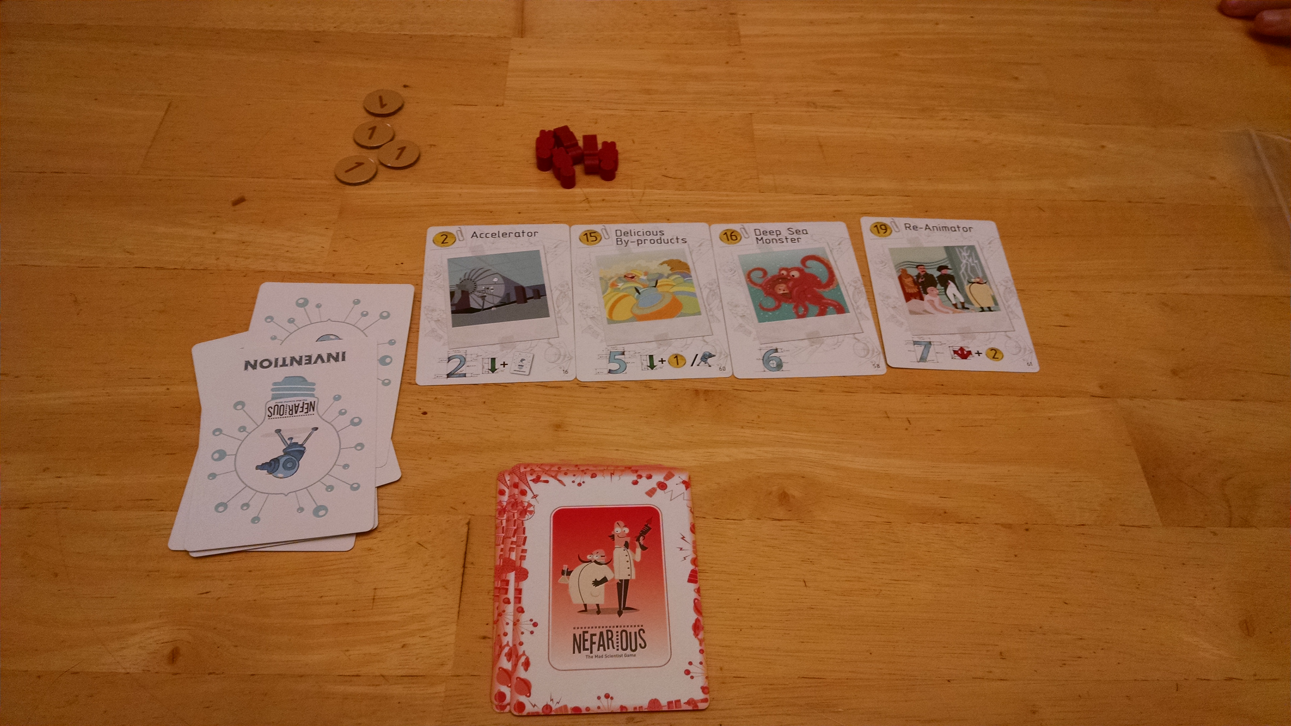 Basics-What are we going to do tonight?  TRY TO TAKE OVER THE WORLD!  In Nefarious, players each take the roles of different mad scientists trying to each take over the world.  The game starts simply enough with each player getting  some starting gold and invention cards.  Each turn, players secretly selected one of four actions, reveal them at the same time, and all actions of the same type happen simultaneously.  The actions are: espionage, invent, research, and work.  Work simply earns you more money.  Research earns you a bit less money, and you get to draw a new invention card.  Invent is the meat of the game.  When you invent, you pay money and reveal one of your invention cards.  These cards have a cost that you pay, a victory point total, and possibly some effects like gain money, cost your opponents money, or gain more invention cards.  Espionage is an investing mechanic.  When you do espionage, you select an action and place a meeple on that action on the main board.  When a player on your right or left takes that action, you gain money equal to the number of meeples you have on that action.  Once all four actions are resolved, players then select new actions, and play continues the same way.  What makes this game a little deeper than it seems are the twist cards.  Each game two twist cards are secretly drawn from a deck of cards.  These cards provide new twists on the game like giving you strange new abilities, taking away some actions, or just removing some money from some of the actions.  When a round ends, a player has at least 20 points, and that player has more points than any other player, the game is over and that player wins and conquerors the word!
